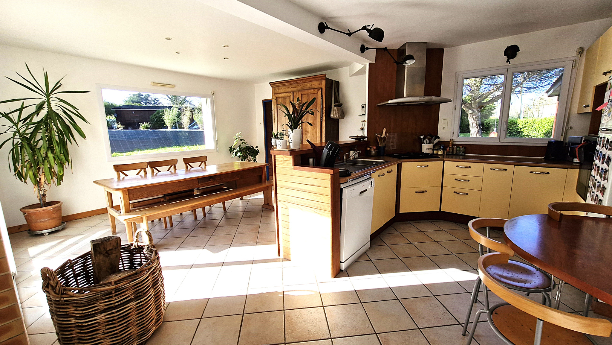 Conçue pour une vie de plain pied, cette maison offre au rez de chaussée un espace de vie complet et fonctionnelle : une grande pièce à vivre lumineuse, exposée sud-ouest, avec une cuisine ouverte et une cheminée design de marque Bordelet, une chambre, une salle d'eau, des toilettes, ainsi qu'une buanderie spacieuse communicante avec le garage et un carport. Une extension en ossature bois d'environ 22m² sous toit cathédrale et charpente apparente, complète cet ensemble avec un espace polyvalent (bureau, atelier, salon...), baigné de lumière.