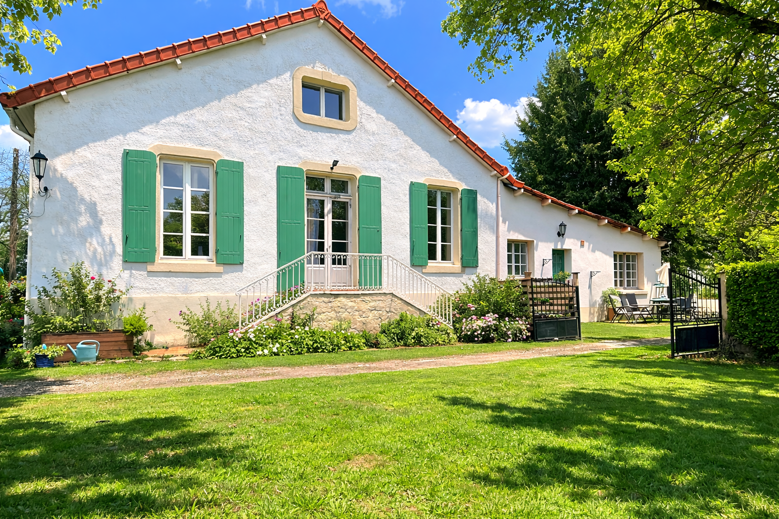Situated in a quiet village, this charming property offers a 3-bedroom main house plus a connected 1-bedroom gîte, ideal for rental income or independent family living.The ground floor features an impressive entrance hall, ground-floor bedroom and bathroom, and a grand lounge with chandeliers, log burner and striking spiral staircase. Off the lounge is a versatile room currently used as a library, music room and study, which could also serve as a dining room or additional bedroom. There is also a bright conservatory and a light-filled kitchen with island and garden access.Upstairs are two further bedrooms and a shower room.The gîte includes a lounge, kitchen, bedroom and bathroom, with internal access from the main house.Set beside the river, the property sits within a beautiful mature garden of 6,865 m², with an above-ground pool and river access at the rear.
