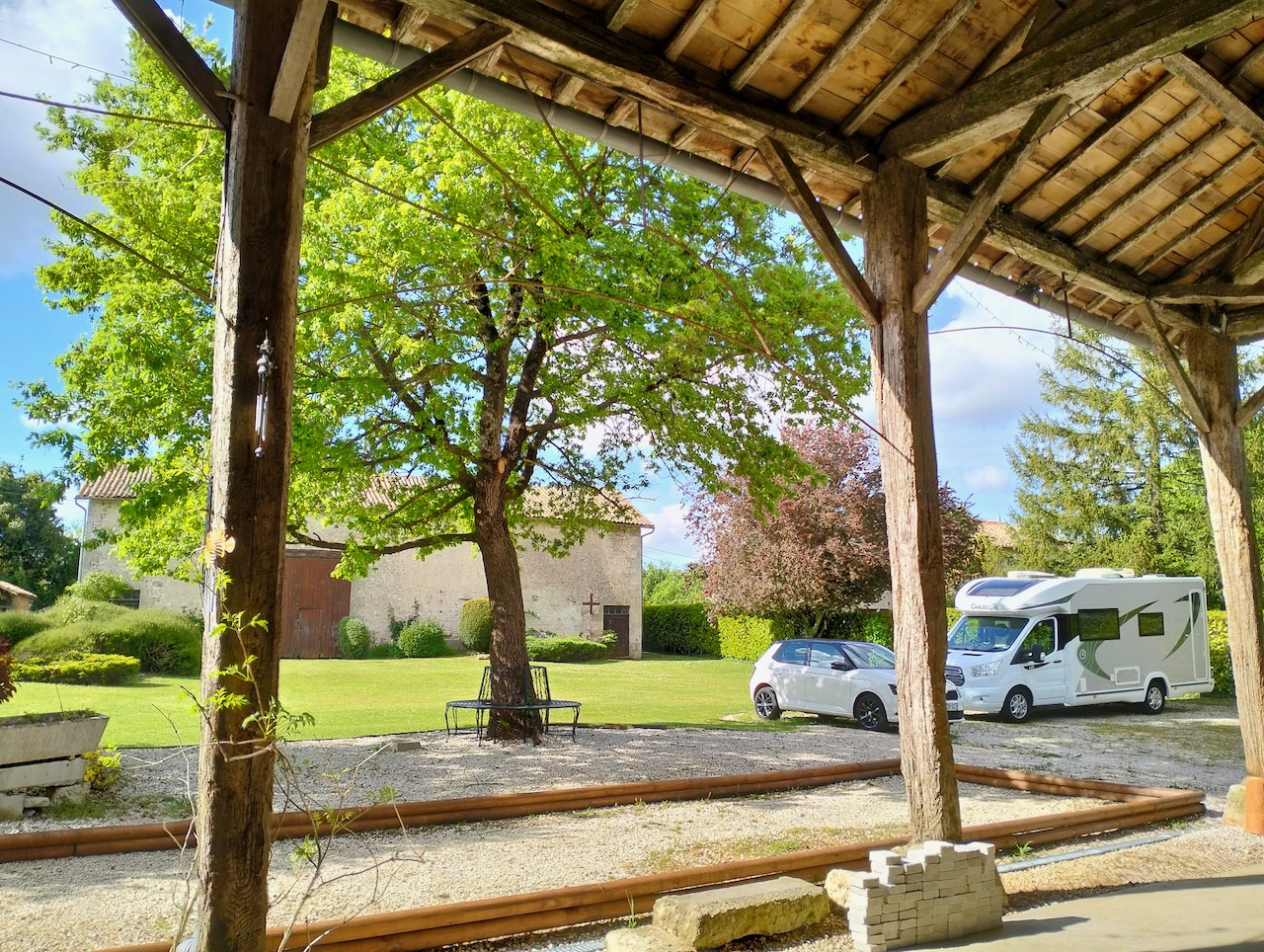 The property is accessed through electric gates and opens onto a beautifully maintained garden. Upon arrival, you will immediately notice the impressive covered terrace with magnificent exposed beams and a cathedral-style roof. This spectacular space is perfectly suited for parking a motorhome while still providing a generous reception area, with the potential to create a summer kitchen overlooking the garden and pétanque court. An elegant chandelier suspended from the roof structure adds a touch of character and charm.
