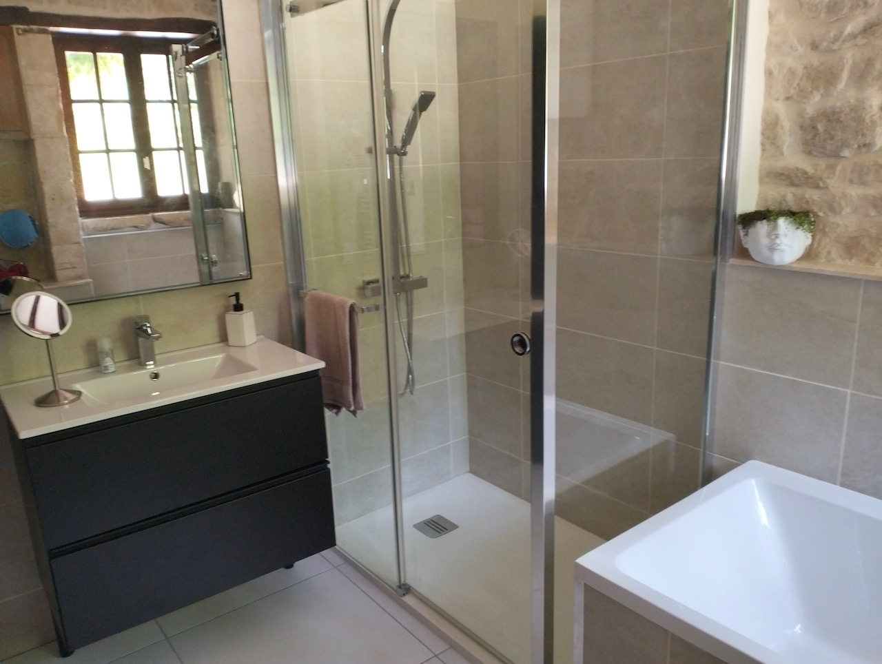 Inside, a large entrance hall leads to a beautiful bathroom finished with attractive stone features, equipped with a bathtub, a large shower, and a WC.