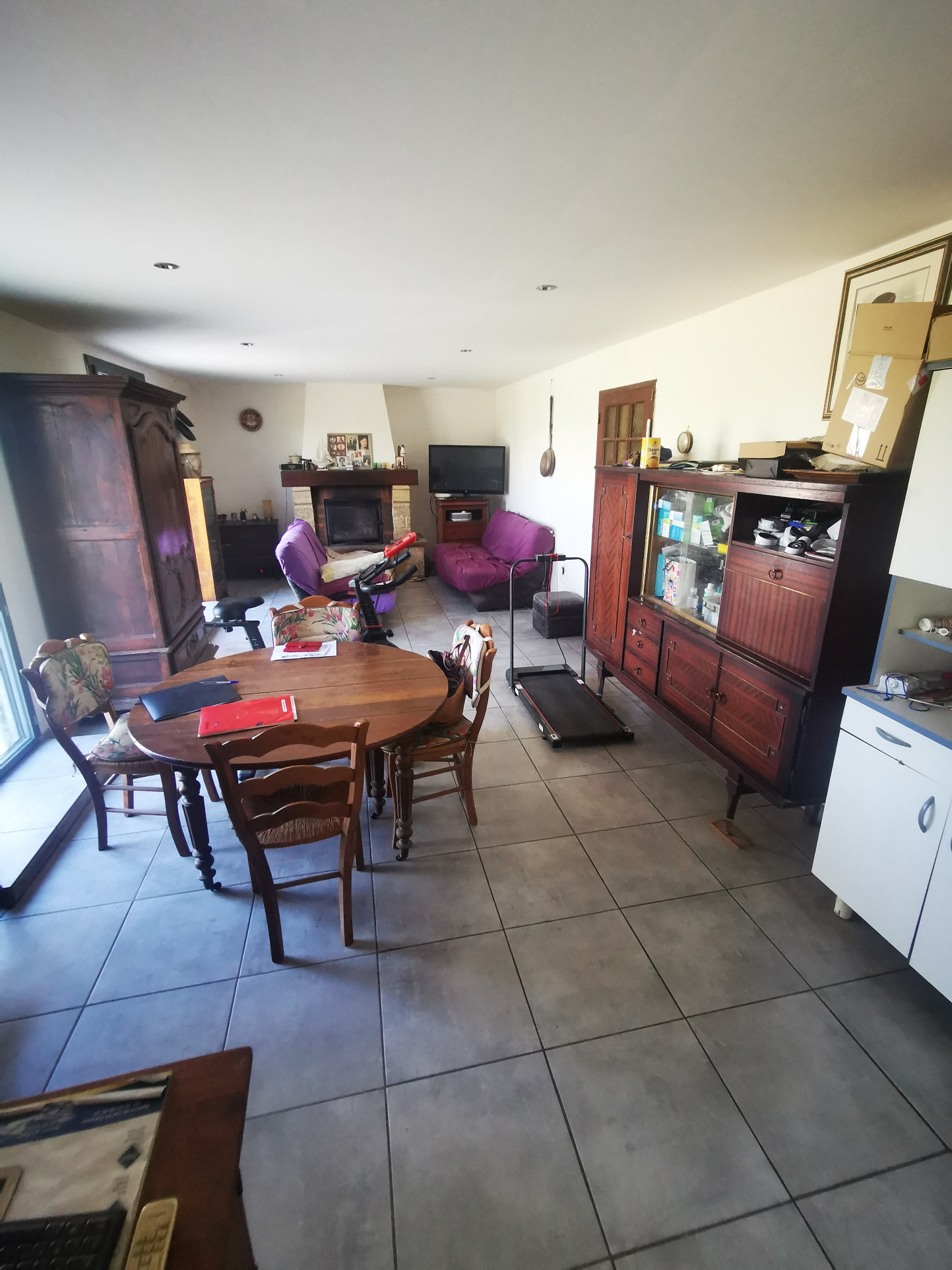 Le séjour, avec cheminée (insert) offre une surface de 32 m².