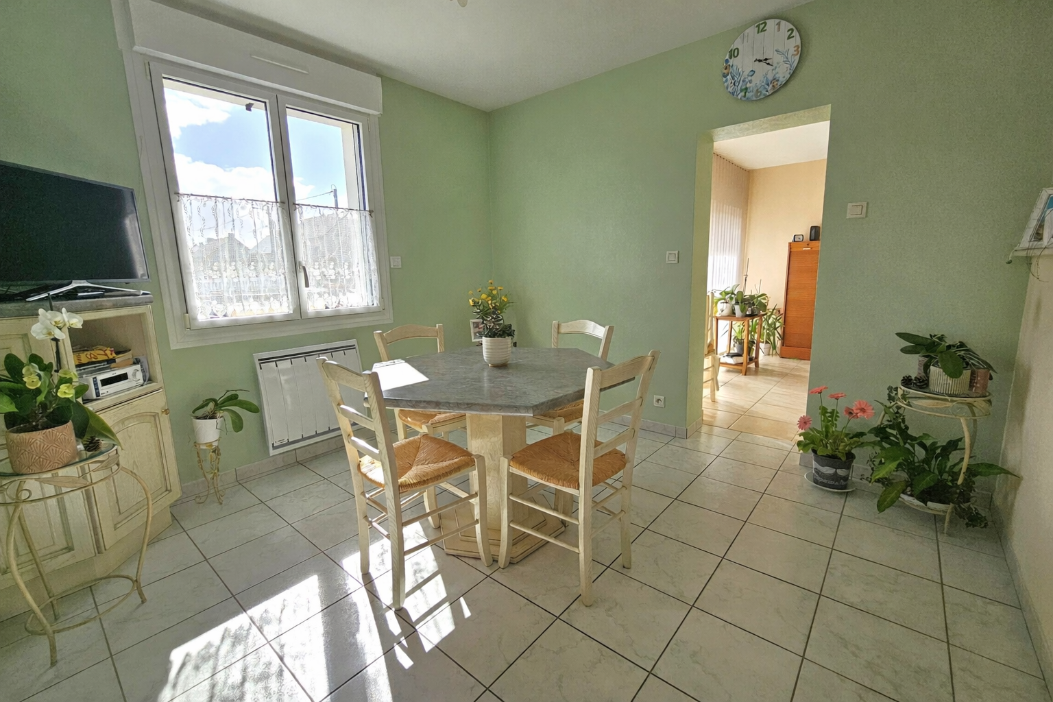Dès l’entrée, vous découvrez une agréable pièce de vie baignée de lumière grâce à sa double exposition, offrant un ensoleillement optimal tout au long de la journée.