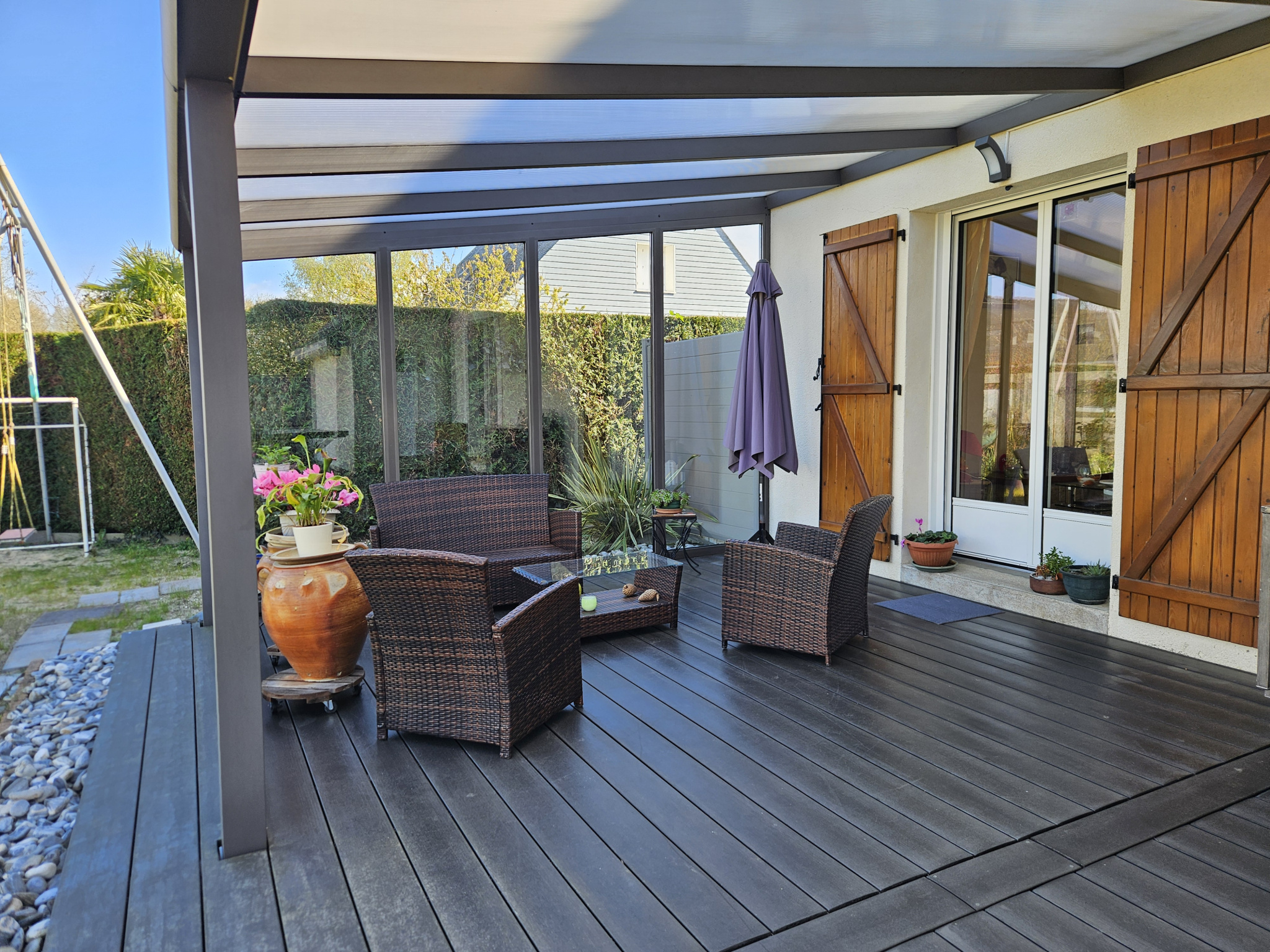 À l’extérieur, tout est pensé pour profiter pleinement : terrain clos, terrasse couverte, garage, espace potager et poulailler…
