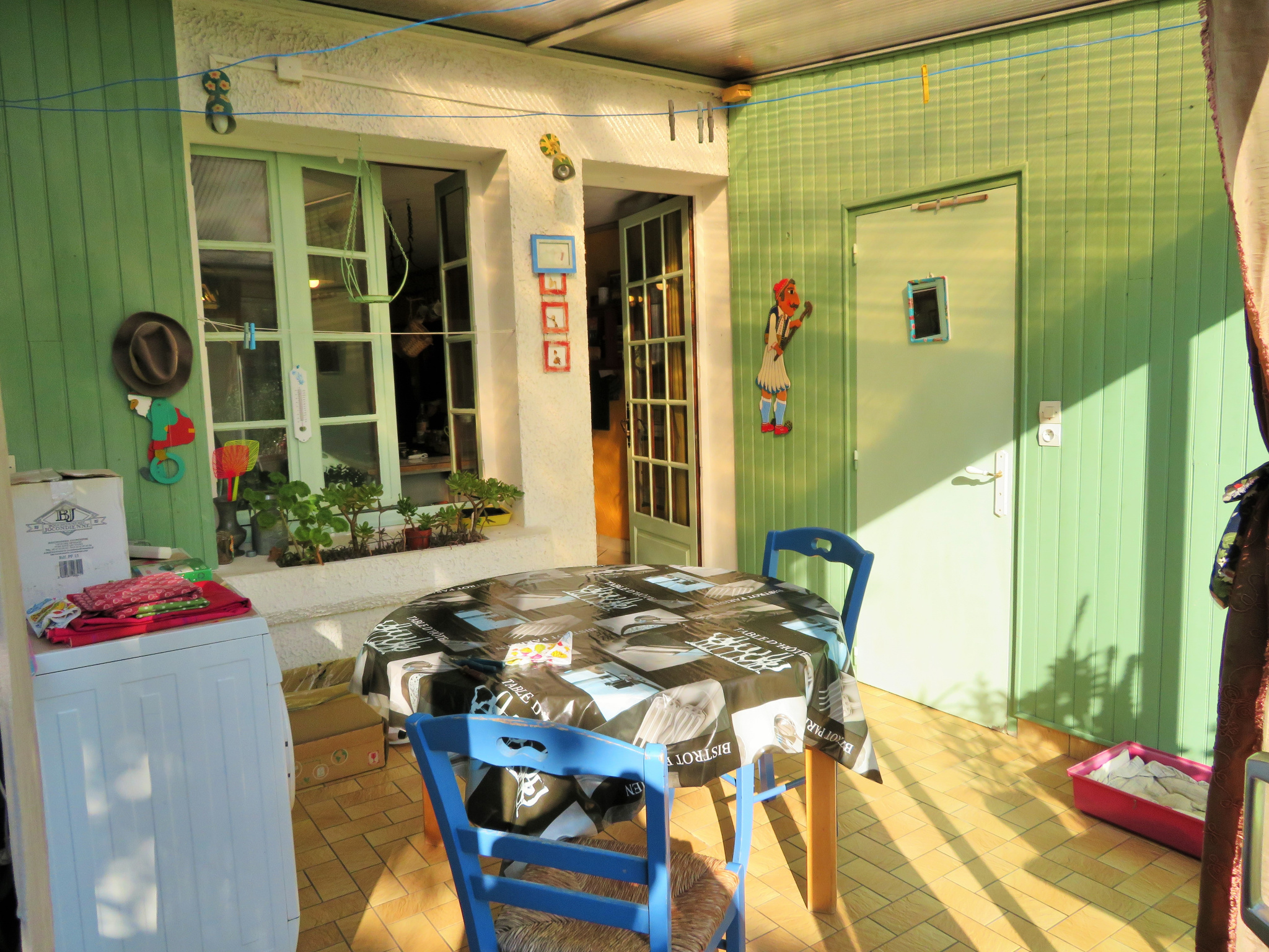 Elle offre une entrée donnant sur un séjour ou salon, cuisine avec coin repas, une véranda et buanderie, WC, une salle de bains.
